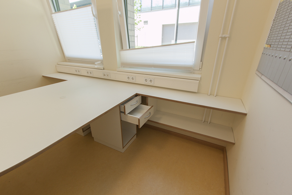 Dass auch Teamräume und Büros der Kita-Leitung dank Holz enorm gewinnen können, zeigen wir Ihnen gern persönlich: Funktionelle, dabei aber auch formschöne Schreibtische fügen sich zusammen mit passgenauen Regalen und Schränken selbst in kleine Räume perfekt ein – und schaffen so ein beruhigendes und dezent repräsentatives Arbeitsumfeld.