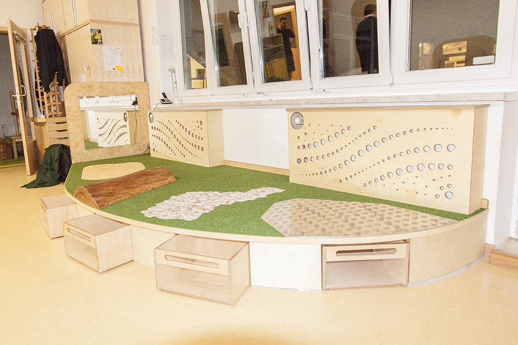 Für den Krippenbereich einer Hamburger Kita ist diese Podestlandschaft entworfen und gefertigt worden. Ein flaches Spielpodest mit unterschiedlichen Oberflächenbelägen (Teppich, Holz, Metall, Baumstamm und Stein) lädt spielerisch zu Sinneswahrnehmungen ein. Die Heizungen wurden fantasievoll verkleidet, ein Spiegel eröffnet neue Perspektiven. In das Podest sind zwei „Bohnenbäder“ flächenbündig integriert, sie sind mit einem Deckel zu verschließen. In die Front eingelassen befinden sich vier Materialkästen. Die angebotenen Materialien sind durch das transparente Kastenvorderstück sichtbar. Das Podest hat eine geschwungene Form. Gegenüber befindet sich ein Spielhäuschen mit Wellentreppe und unterschiedlich gestalteten Treppenstufen. Unterwärts ist ein Krämerladen mit Theke und integriertem Regal, das Obergeschoss ist ein gut einsehbarer Ruhe- und Rückzugsbereich mit Tretfordteppich-Belag.