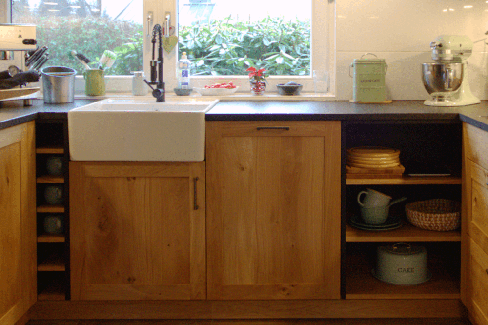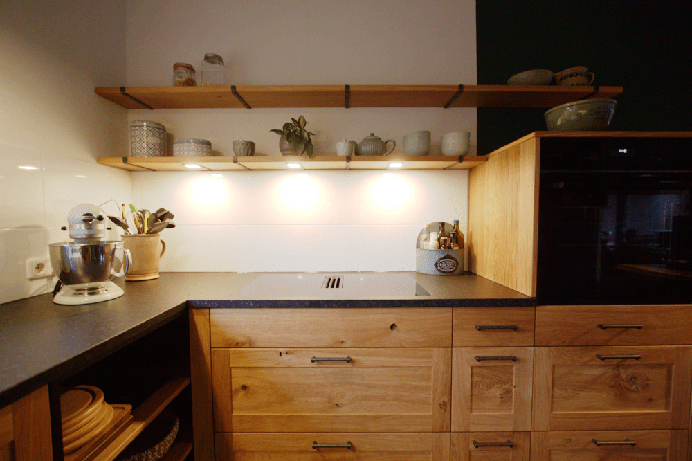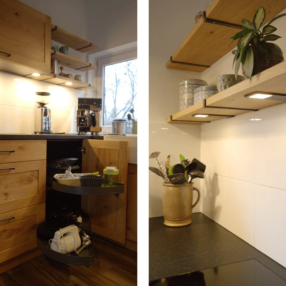 Die gezeigte Küche wurde individuell nach Kundenwunsch geplant. Oberflächen, Anordnung und Arbeitshöhe sind genau abgestimmt und auf die Bedürfnisse des Kunden angepasst worden. Die massiven geölten Eichenholzfronten in Kombination mit der Natursteinarbeitsplatte, dem eingesetzten Spülstein und dem flächenbündigen Induktionskochfeld mit integriertem Dunstabzug verleihen der Küche eine hohe Wertigkeit. Durch reichlich Stauraum in den vielen großen Schubkästen der Unterschränke wurden aus Gründen der Leichtigkeit über der Arbeitsfläche Eichenborde mit LED-Licht unterwärts angeordnet. Für die Ergonomie ist der Backofen auf Höhe der Arbeitsfläche eingesetzt worden.