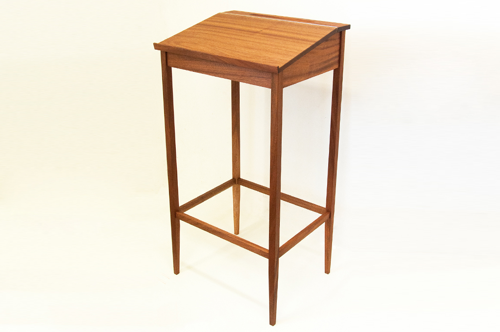 Ein Stehpult aus massivem Mahagoni in klassischer Stollenbauweise. Unter der hochklappbaren Arbeitsfläche bietet ein Fach Stauraum.